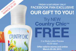 This is good through today and tomorrow!  New Country Chic 2oz Body lotion Preview FREE!  No purchase necessary!  While supplies last!